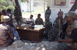 Above: Chamblain along with other FLRN criminal paramilitaries holding "court" in one of their "liberated" towns, judging youth suspected of supporting Haiti's pro-democracy movement. (Photo: CC)