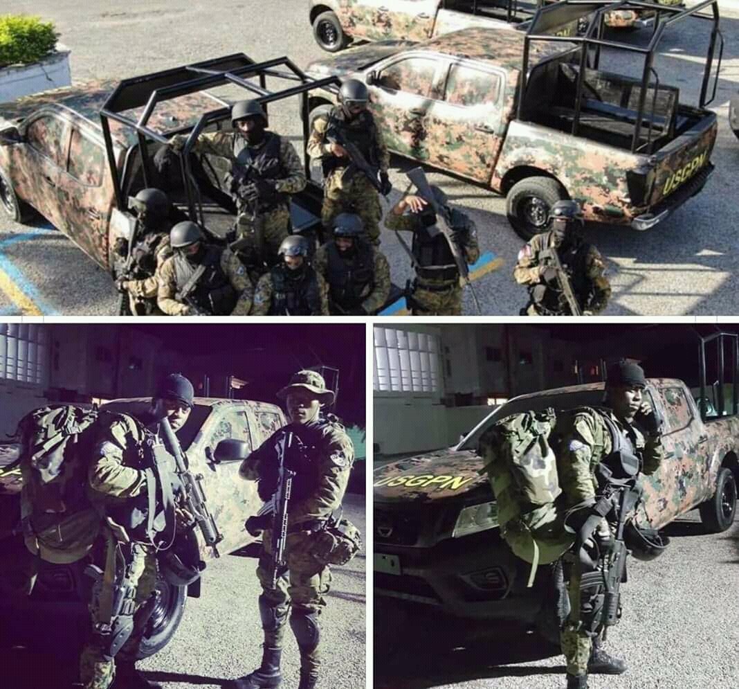 l'Unité de sécurité générale du Palais national (USPGN) and it looks like they have received a shipment of M-4 automatic machine guns with different variants (made in the USA). Also one should note that a number of white men are masked and operating alongside the armed group, believed to be PMCs (private military contractors).