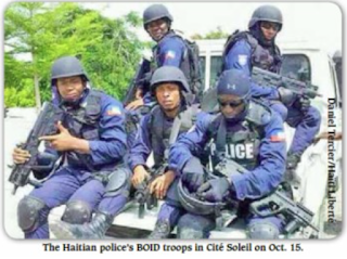 October, 2015: In the run-up to presidential elections (just days prior), a new special police unit known as BOID (Brigade for Departmental Intervention Operations) carried out a violent operation in the popular neighborhood of Cite Soleil (a stronghold of support for Lavalas). The raid claimed over 20 lives according to Haitian media, including two pregnant women and a ten your old child. The new police brigade is said to include individuals from among the new group of cadets trained in Ecuador. (Photo: Courtesy of Haiti Liberte/Daniel Tercier)