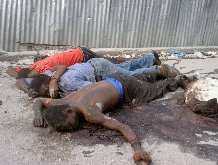 A Miami University Human Rights Study described the photo above as the “The Carrefour Pean massacre”. They reported that, “The gaping hole in the head of the boy at the far right... suggests the use of a large-caliber gun, at very close range.” Human rights investigators gathered a good deal of other disturbing photographic evidence, documenting extrajudicial executions and widespread politically motivated attacks by paramilitary-police forces. (Photo: Courtesy of TeleSUR reporter Reed Lindsay)