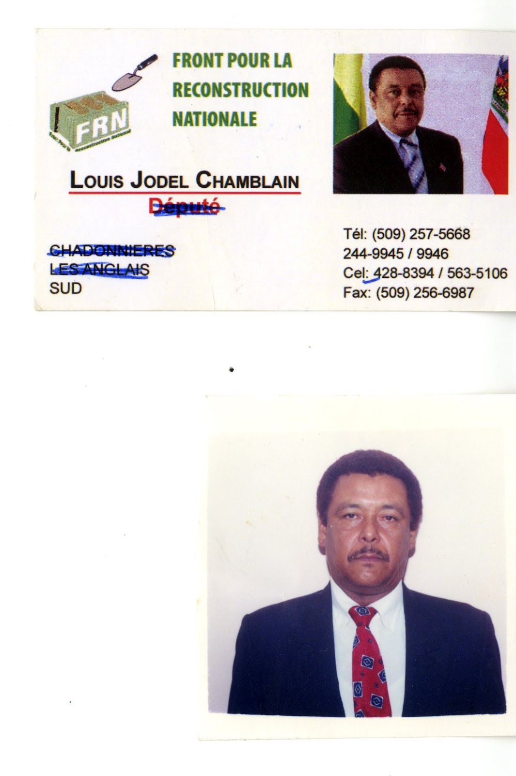 Above: Passport photo and business card of Louis-Jodel Chamblain (co-founder of FRAPH and a leader of the FLRN and later the FRN "political party"). He was the mastermind of numerous assassinations of pro-democracy activists and leaders. In 2010, he headed up security for former dictator Jean-Claude Duvalier following his secret entry into the country. This photo and business card were provided by Chamblain to the author during an interview in 2007 at the Hotel Ibo Lele where he lived in luxury in the Pétionville neighborhood of Port-au-Prince. (Provided to the author by Louis-Jodel Chamblain)