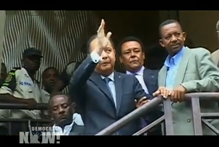 Jean-Claude Duvalier (center), with his chief of security Louis-Jodel Chamblain (to his right) in the days following his return in January of 2011. (Video-still: Courtesy of Democracy Now! Pacifica Radio)